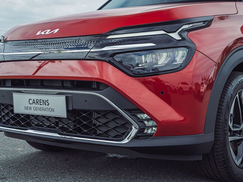 Thiết kế đèn pha và đèn hậu của Kia Carens 2025 dễ gợi liên tưởng đến mẫu Sportage thế hệ mới nhất. Lưới tản nhiệt mũi hổ 2 tầng nối liền với dải đèn LED định vị ban ngày có thiết kế độc đáo.